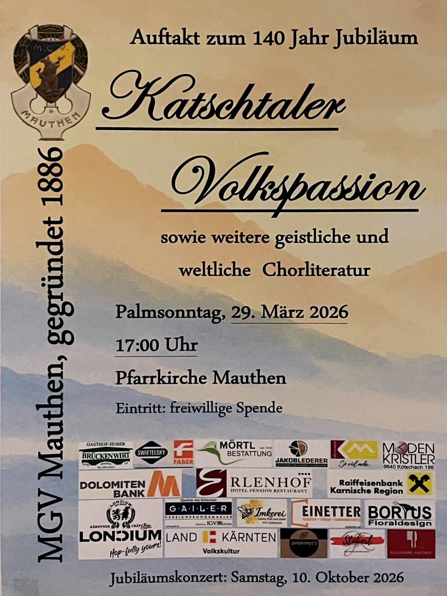 Probe, damit auch junge sowie auswärtige Leute die Möglichkeit haben mitzusingen. Gesungen und einstudiert wird vor allem das Kärntnerlied, wobei auch deutsche Volkslieder, internationales Liedgut, Schlager und Modernes sowie geistliche Lieder im Repertoire zu finden sind. Den Verein zeichnet eine besondere Kameradschaft aus, die durch viele Aktivitäten, wie Eisstocksschiessen, Sängerfahrten, Fischessen, Grill- und Kameradschaftsabend, gestärkt wird. Weiters pflegt der Chor Kontakte im In- und Ausland. So konnte man unter anderem einige Sängerfahrten nach Italien, Deutschland und auch innerhalb von Österreich sowie vor allem in Kärnten wahrnehmen: der MGV Mauthen durfte als Gastchor beim 125 Jahr Jubiläum des MGV Kaning mitwirken, oder aber auch wurde beim Jubiläumskonzert 2016 im Rathaussaal Kötschach- Mauthen der Gemischte Chor Koschatwiege Klagenfurt-Viktring begrüßt.